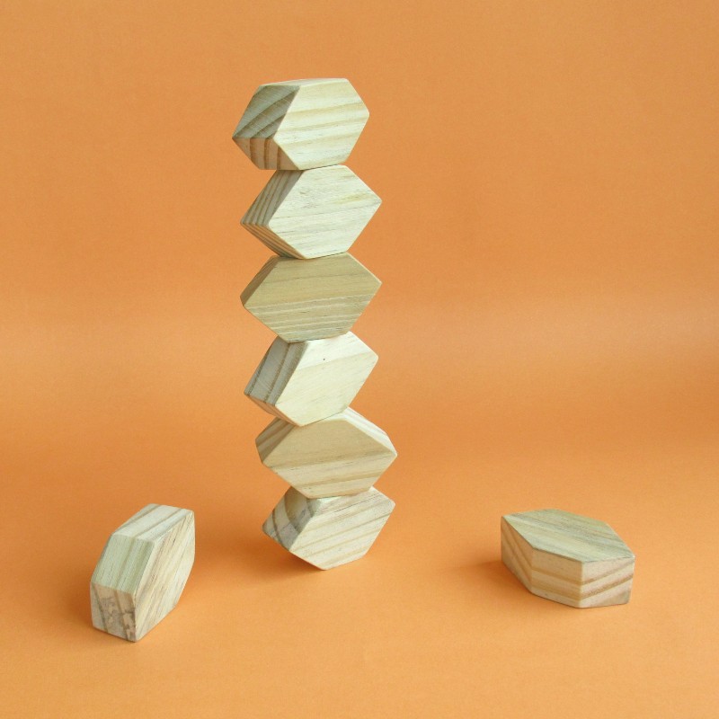 As peças do “Empilha ou tomba?” possuem ângulos diferentes uns dos outros, dando dinâmica à brincadeira e oferecendo diversas possibilidades de brincar.