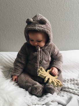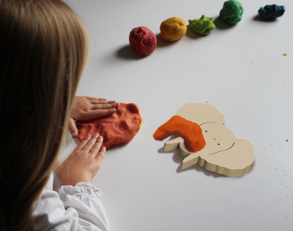 Os animais em madeira, com bordas arredondadas, contém espaços vazios para que os bebês segurem o brinquedo e que as crianças maiores preencham com massinha de modelar.