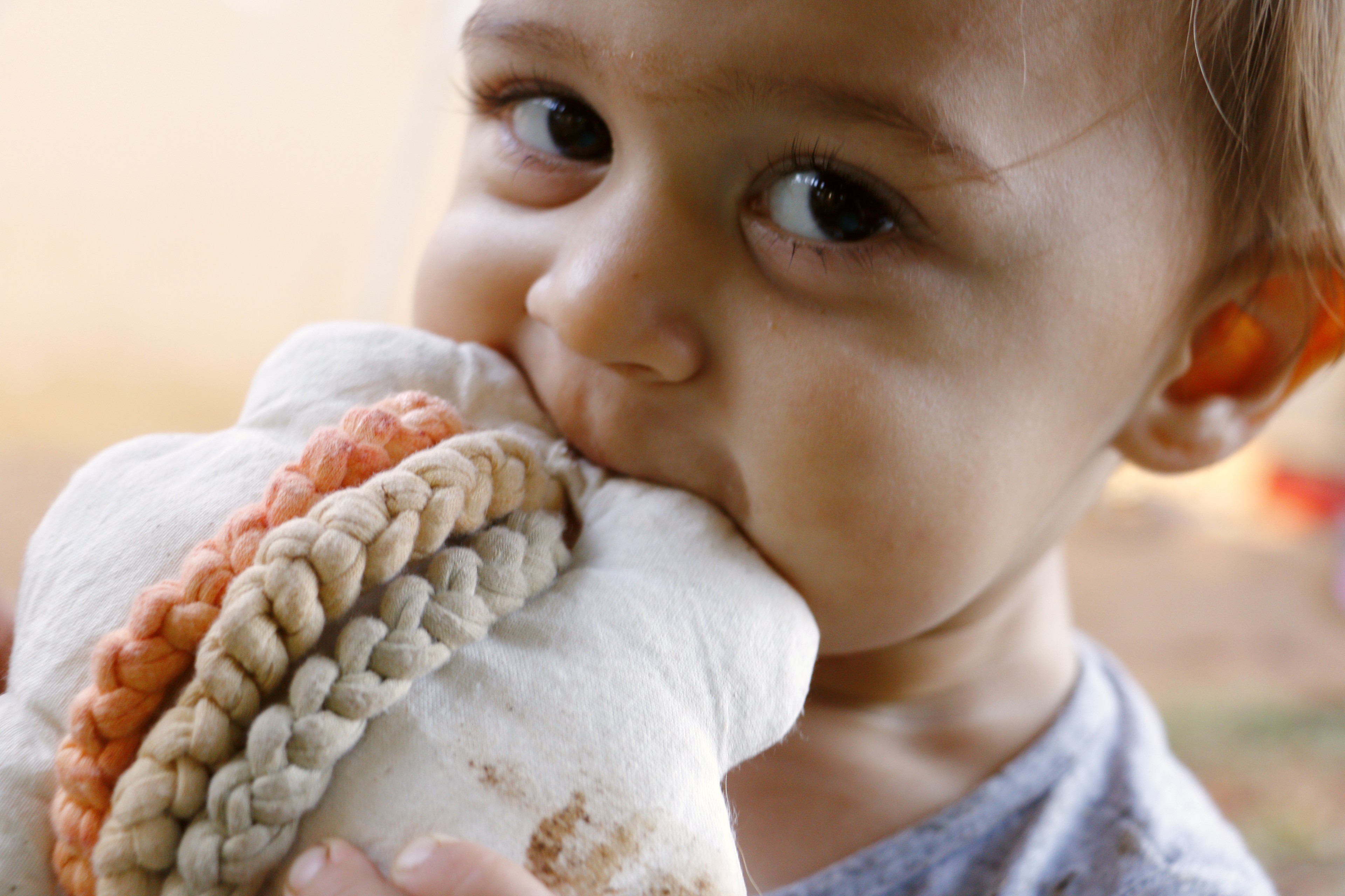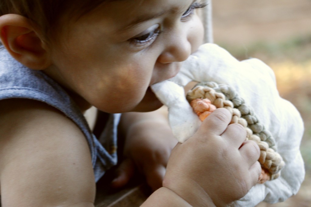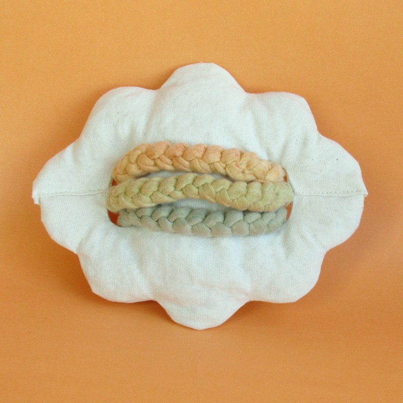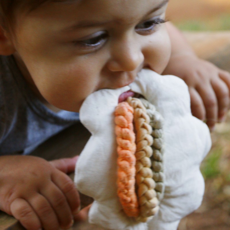 O mordedor Arco-íris ajuda no bem-estar do bebê no período de crescimento dos dentinhos. O mordedor também estimula os sentidos através de texturas e cores. O tingimento natural foi utilizado para obter as cores.